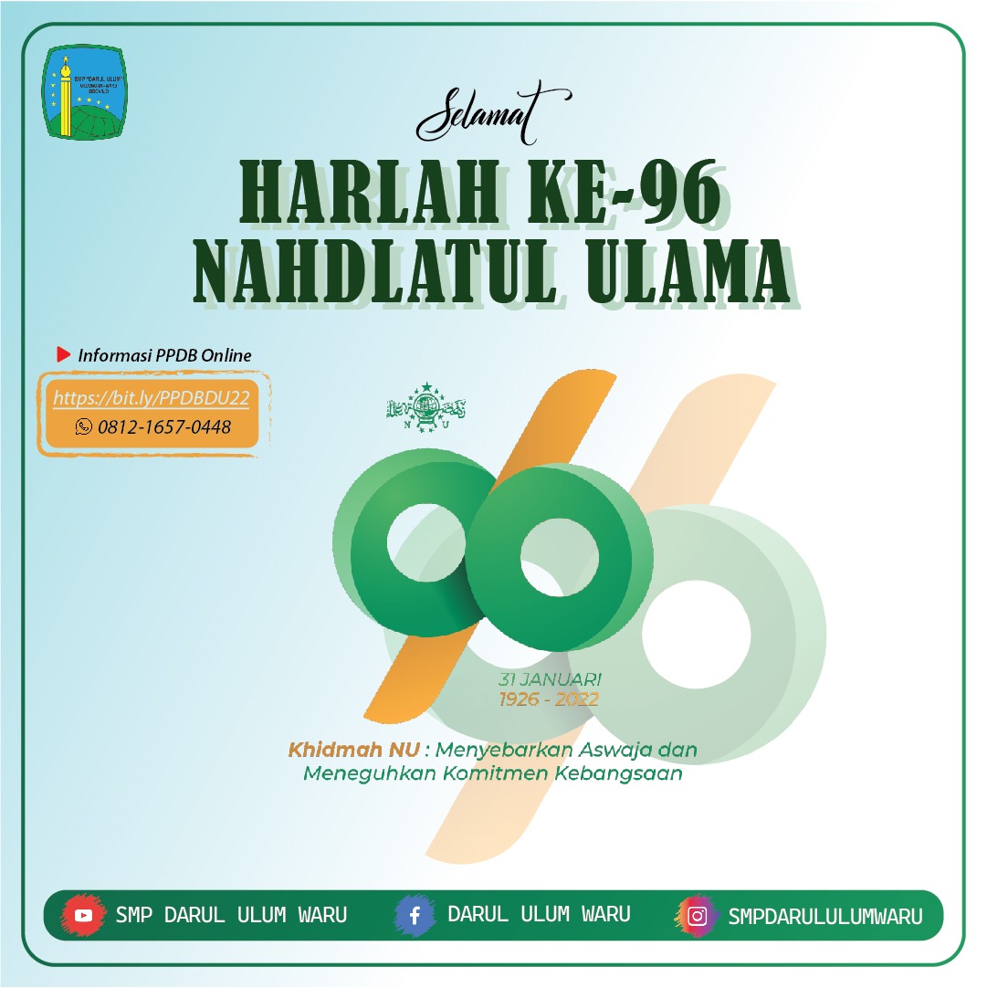 Kami keluarga besar SMP Darul Ulum Waru mengucapkan Selamat dan Sukses atas Harlah Nahdlatul Ulama Ke-96. Dengan segenap warisan yang mulia untuk setiap nilai yang diwariskan oleh generasi kita, sesuai dengan khidmah NU tema yang di angkat pada Hari Lahir NU tahun ini yaitu “Menyebarkan Aswaja dan Meneguhkan Komitmen Kebangsaan”.