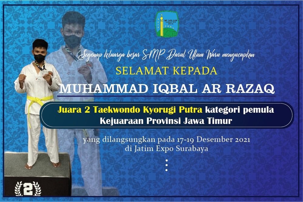 Kami Segenap Keluarga Besar SMP Darul Ulum Waru mengucapkan Selamat kepada Muhammad Iqbal Ar Razaq dari Kelas IX-B atas perolehan Juara II Taekwondo Kyorugi Putra Kategori Pemuda Kejuaraan Provinsi Jawa Timur yang dilangsungkan pada 17-19 Desember 2021 di Jatim Expo Surabaya.